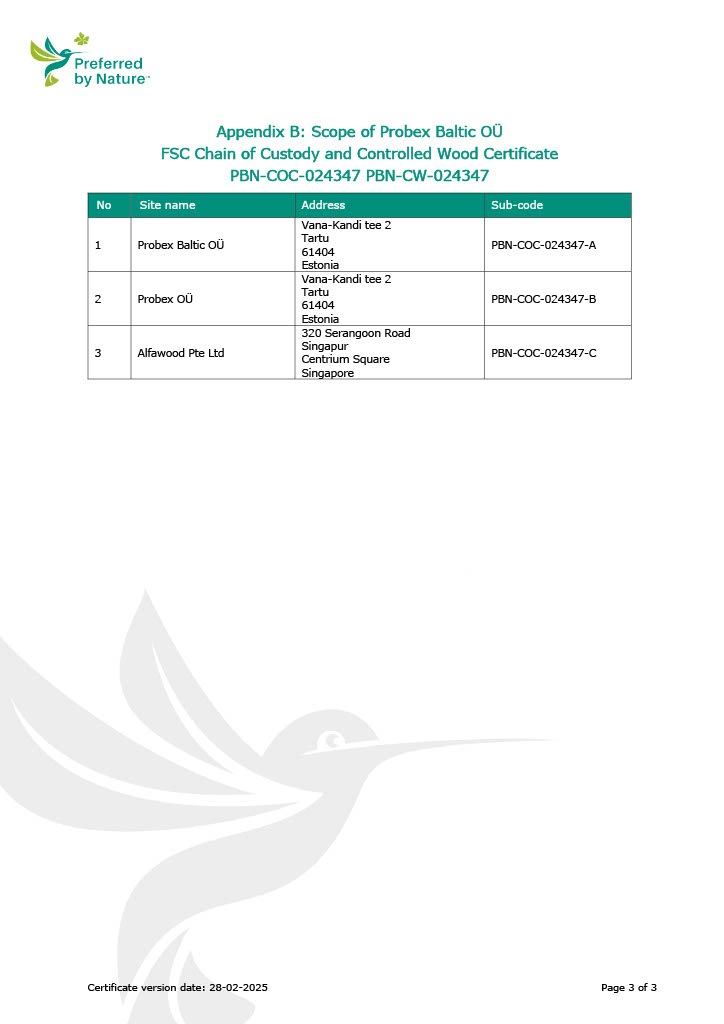 NEPCon on sertifitseerinud Probex Baltic OÜ vastavalt Forest Stewardship Council® (FSC®) tarneahela sertifitseerimisstandardile.